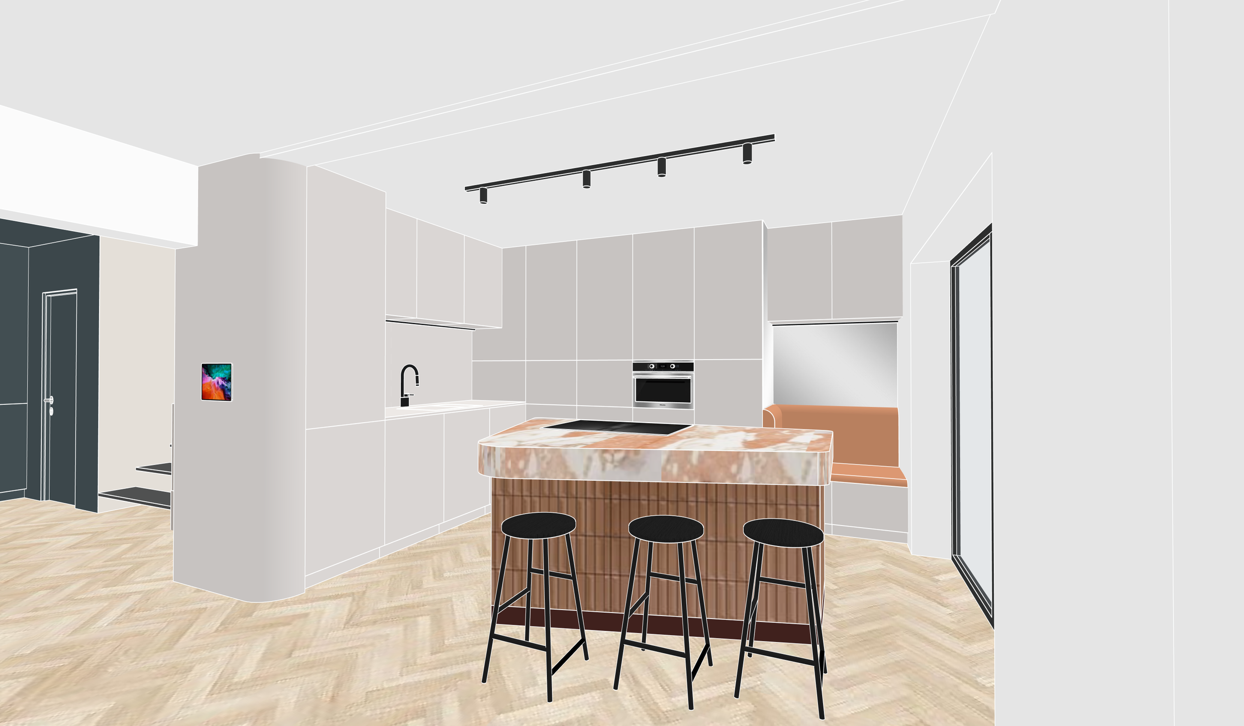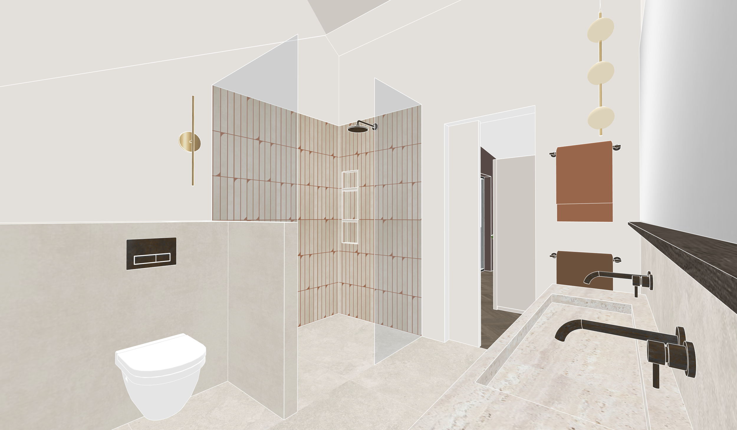 Der Dachraum umfasst einem gemütlichen Schlafbereich mit Ensuite-Badezimmer, Ankleidezimmer sowie Dachterrasse und Arbeitszone.